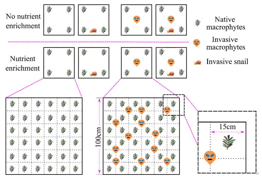 針對以上研究空白,中科院東北地理所生物入侵生態學團隊與中科院亞熱帶所洞庭湖站研究人員共同合作實施了一個中宇宙實驗,探究水體富營養化如何影響外來動物福壽螺與外來水生植物粉綠狐尾藻的共同入侵以及三者如何交互影響本地植物群落。實驗設計如圖1所示:對由三種水生植物組成的本地群落分別施加入侵動物福壽螺(有采食vs無采食)、入侵植物粉綠狐尾藻(有植物入侵vs無植物入侵)和養分富集(是與否)的全因子處理。