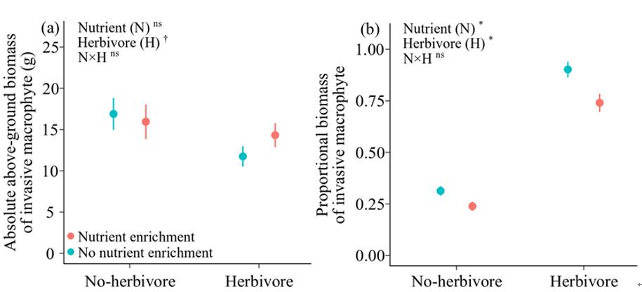人類活動和全球氣候變化的加劇導致許多生態系統經歷著外來植物與外來動物的同時入侵。 “入侵崩潰假說”(Invasional meltdown hypothesis)認為,多種外來生物在入侵同一生態系統時會相互促進彼此的入侵進程,加劇對本地群落的負面影響。盡管該假說得到了許多實證研究的支持,但對于水生生態系統中來自同一產地的外來植物與外來植食性動物的協同入侵機制仍缺乏足夠關注。因協同進化歷史的差異,外來植食性動物對與其同一原產地的外來植物產生的負面影響要弱于對本地植物產生的負面影響。因此,似然競爭(Apparent competition)可能會調控兩者的協同入侵過程。另外,除生物入侵外,水體富營養化也成為威脅淡水生態系統健康的重要環境問題,其是否會與生物入侵互作影響本地群落也有待明確。