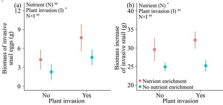 (4)福壽螺生長與繁殖的記錄數據表明,入侵植物粉綠狐尾藻的存在極大地提高了入侵動物福壽螺的產卵量(圖5a);并且,富營養化導致入侵動物福壽螺的生物量顯著增加(圖5b)。