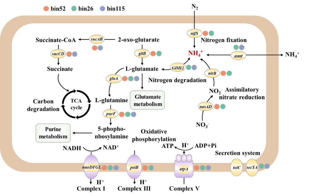 BMP與PE-MP微塑料圈中氮代謝關(guān)鍵微生物組成也存在明顯差異,變形菌在BMP上顯著富集而PE-MP微塑料圈增加了放線菌豐度,其中Ramlibacter主導(dǎo)了BMP與PE-MP微塑料圈中多條氮代謝差異途徑,BMP殘留增加土壤中Ramlibacter豐度的同時刺激該菌在微塑料圈中的進(jìn)一步富集。利用宏基因組binning技術(shù)拼接獲得29個高質(zhì)量基因組,均分類為變形菌和放線菌,其中bin115.bin53和bin26都分類為Ramlibacter,這3個新型物種基因組(ANI<95%)含有調(diào)控氮降解、氮固定和同化硝酸鹽還原代謝路徑的多個拷貝基因,這些代謝路徑共同指向于銨態(tài)氮的生成。進(jìn)一步發(fā)現(xiàn)BMP微塑料圈中的微生物物種調(diào)控氮代謝合成自身所需氮素的同時,通過攜帶的氨轉(zhuǎn)移基因,可將微塑料圈中的有效氮素轉(zhuǎn)運到土壤中,通過測定土壤中銨態(tài)氮的含量發(fā)現(xiàn),BMP殘留土壤中的銨態(tài)氮含量的確高于CK和PE-MP土壤,進(jìn)而驗證了微生物基因組氮代謝機(jī)制(圖2)。該研究揭示出生物可降解地膜源微塑料較傳統(tǒng)地膜促進(jìn)土壤有效氮素累積,為推進(jìn)傳統(tǒng)地膜的減量與替代提供微生物學(xué)理論依據(jù)。