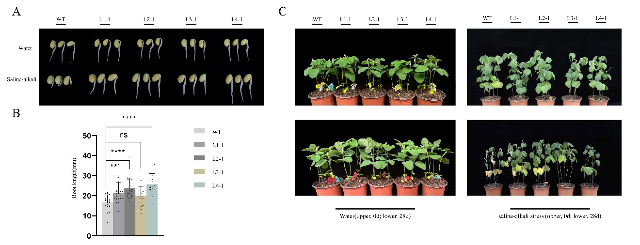 圖1. 過(guò)表達(dá)AhALDH3H1基因提高大豆芽期和苗期鹽堿耐受性