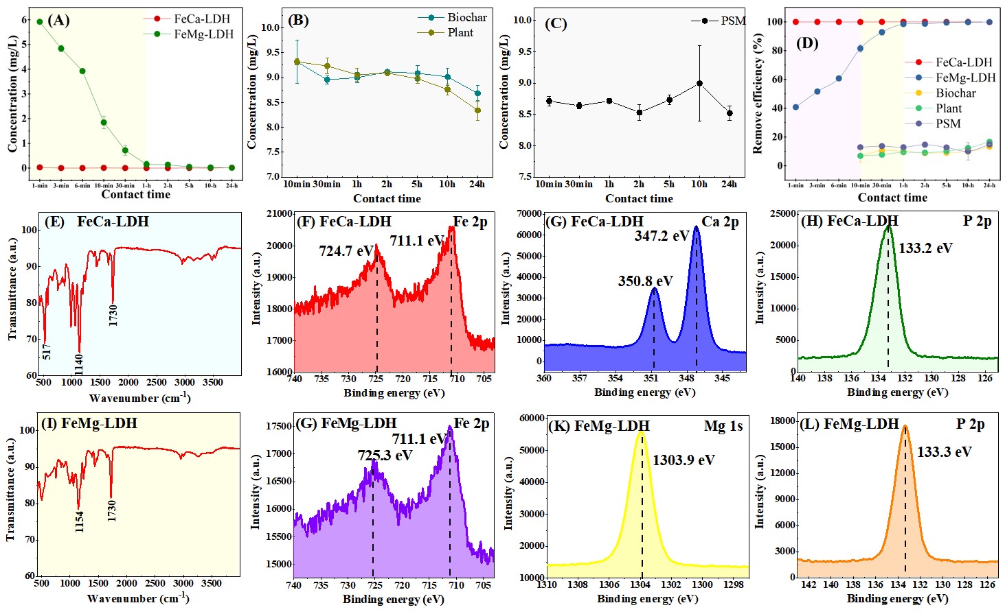 根據(jù)水滑石的層狀結(jié)構(gòu)特點和層間離子可交換屬性,東北地理所水環(huán)境污染防治團(tuán)隊通過控制金屬陽離子的比例、pH和溫度等反應(yīng)條件,采用共沉淀法成功合成了純凈的鐵基層狀雙氫氧化物(FeCa-LDH、FeMg-LDH)(圖1),其通式為[M1-x2+Mx3+ (OH)2]x+ (An-)x/n·mH2O,M2+和M3+是二價和三價金屬陽離子,其與OH-共同構(gòu)成了陽性主體層;A是層間陰離子,常見的有Cl-、SO42-、CO32-、HCO3-和NO3-。FeCa-LDH和FeMg-LDH呈六邊形、八面體結(jié)構(gòu)(圖2),孔徑介于6~18 nm之間,純度達(dá)99%以上。模擬實驗結(jié)果表明,污水中磷濃度為10 mg/L,LDH添加量為2.5 g/L條件下,相比生物炭、微生物和植物的對照處理,F(xiàn)eCa-LDH和FeMg-LDH對污水中磷的去除率提高了525% - 661%,處理時間縮短至1 min - 1 h (圖3)。主要去除機制為靜電吸附、配位反應(yīng)和插層交換(圖 4)。研究還發(fā)現(xiàn),堿性條件下FeCa-LDH的除磷率可提高50%左右,但共存陰離子碳酸氫根對磷的去除率有輕微的抑制作用。FeCa-LDH材料的重復(fù)利用性良好,循環(huán)使用第5次時的磷去除率仍可達(dá)85%。該材料也具有良好的濃度波動抗沖擊性能,污水中磷濃度為600 mg/L時,磷的去除率為62%,可應(yīng)用于突發(fā)污染事故的應(yīng)急處理中。