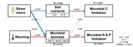 研究表明,短期增溫和秸稈還田除對(duì)土壤全氮含量具有顯著影響外,對(duì)其它基本土壤理化性質(zhì)無(wú)顯著影響。秸稈還田顯著增加了土壤微生物生物量碳和細(xì)菌豐度(16S基因拷貝數(shù)),而增溫顯著降低了土壤微生物生物量碳和細(xì)菌豐度。秸稈還田顯著緩解了微生物磷限制,但增溫和秸稈還田耦合削弱了這一作用效果(圖1)。增溫和秸稈還田主要通過(guò)土壤養(yǎng)分含量變化影響微生物碳限制,通過(guò)影響微生物生物量進(jìn)一步調(diào)控微生物氮磷限制(圖2)。研究結(jié)果闡明了增溫和秸稈還田耦合對(duì)土壤微生物養(yǎng)分限制的影響機(jī)制,進(jìn)一步加深了對(duì)溫帶農(nóng)田生態(tài)系統(tǒng)養(yǎng)分循環(huán)的認(rèn)識(shí)。