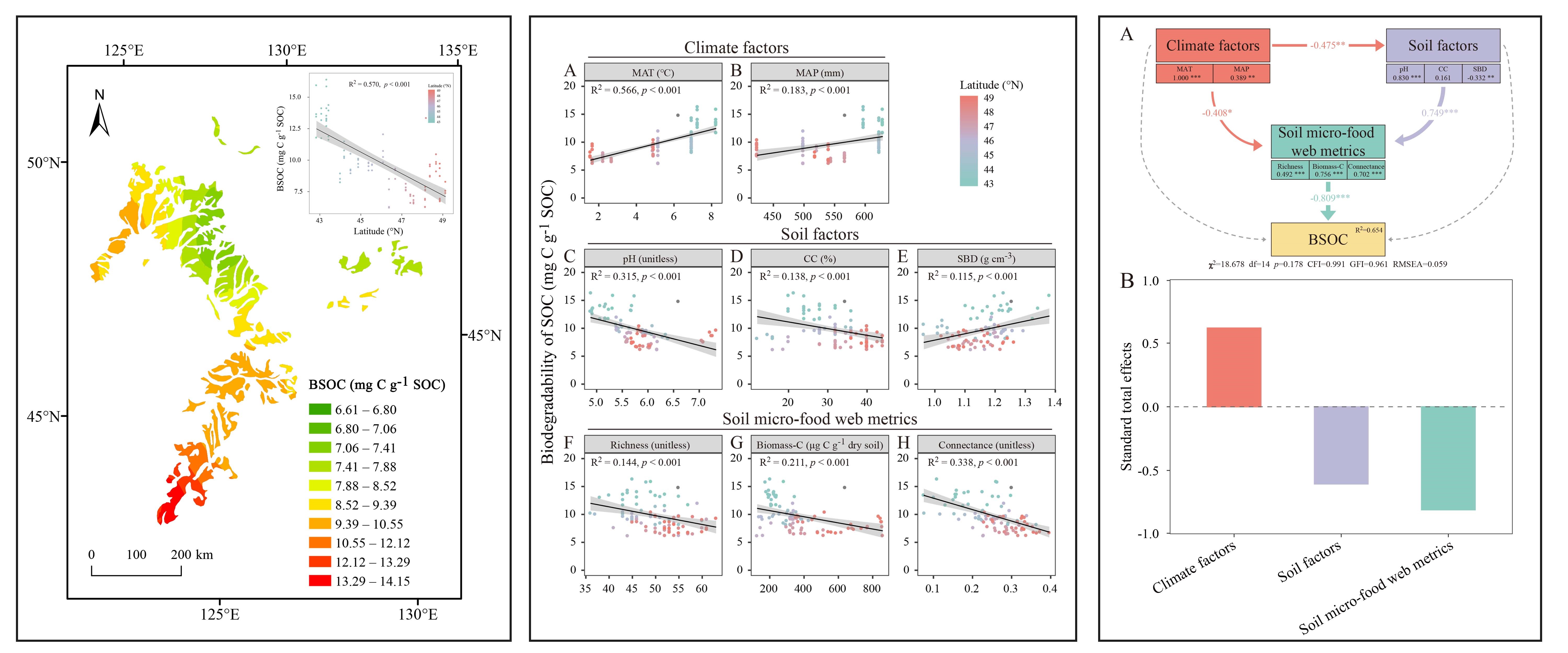 中國科學院東北地理與農(nóng)業(yè)生態(tài)研究所黑土有機碳與保護性耕作學科組科研人員以中國東北典型黑土區(qū)43°N-49°N緯度范圍內(nèi)的農(nóng)田土壤為研究對象,將土壤生物、氣候、土壤因子耦合起來,在區(qū)域尺度上深入揭示了農(nóng)田黑土有機碳生物降解性的緯度分布格局及其驅(qū)動機制。研究發(fā)現(xiàn)土壤有機碳生物降解性隨緯度增加呈現(xiàn)北低南高的分布格局,該變化趨勢主要受到隨緯度變化的土壤微食物網(wǎng)特性(豐富度、生物量碳和連通性)、氣候因子(年平均溫度和年平均降水)、土壤因子(土壤pH、土壤粘粒含量、土壤容重)的調(diào)控作用。通過結構方程模型發(fā)現(xiàn),土壤微食物網(wǎng)特性是影響土壤有機碳生物降解性最直接且最重要的驅(qū)動因素。研究結果強調(diào)了土壤生物在調(diào)控農(nóng)田生態(tài)系統(tǒng)土壤有機碳礦化和固存中的重要作用。