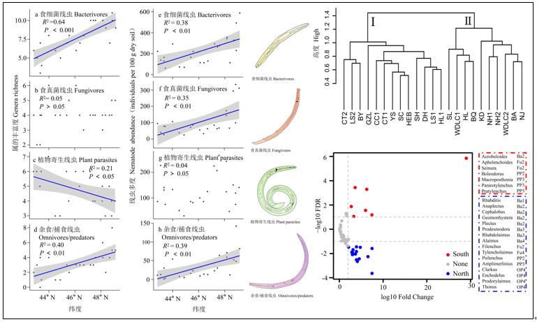 此外,利用形態(tài)學鑒定技術首次全面評估了土壤線蟲群落結構在典型黑土區(qū)的緯度分布格局。研究發(fā)現(xiàn)土壤線蟲總豐富度和總多度的緯度分布格局與土壤有機碳生物降解性類似,均呈現(xiàn)均隨緯度增加而顯著增加的變化趨勢;并且線蟲群落以47°N為分界線可分為南部和北部兩類,土壤pH和土壤容重分別是影響南部與北部黑土區(qū)線蟲群落最重要的環(huán)境因子。