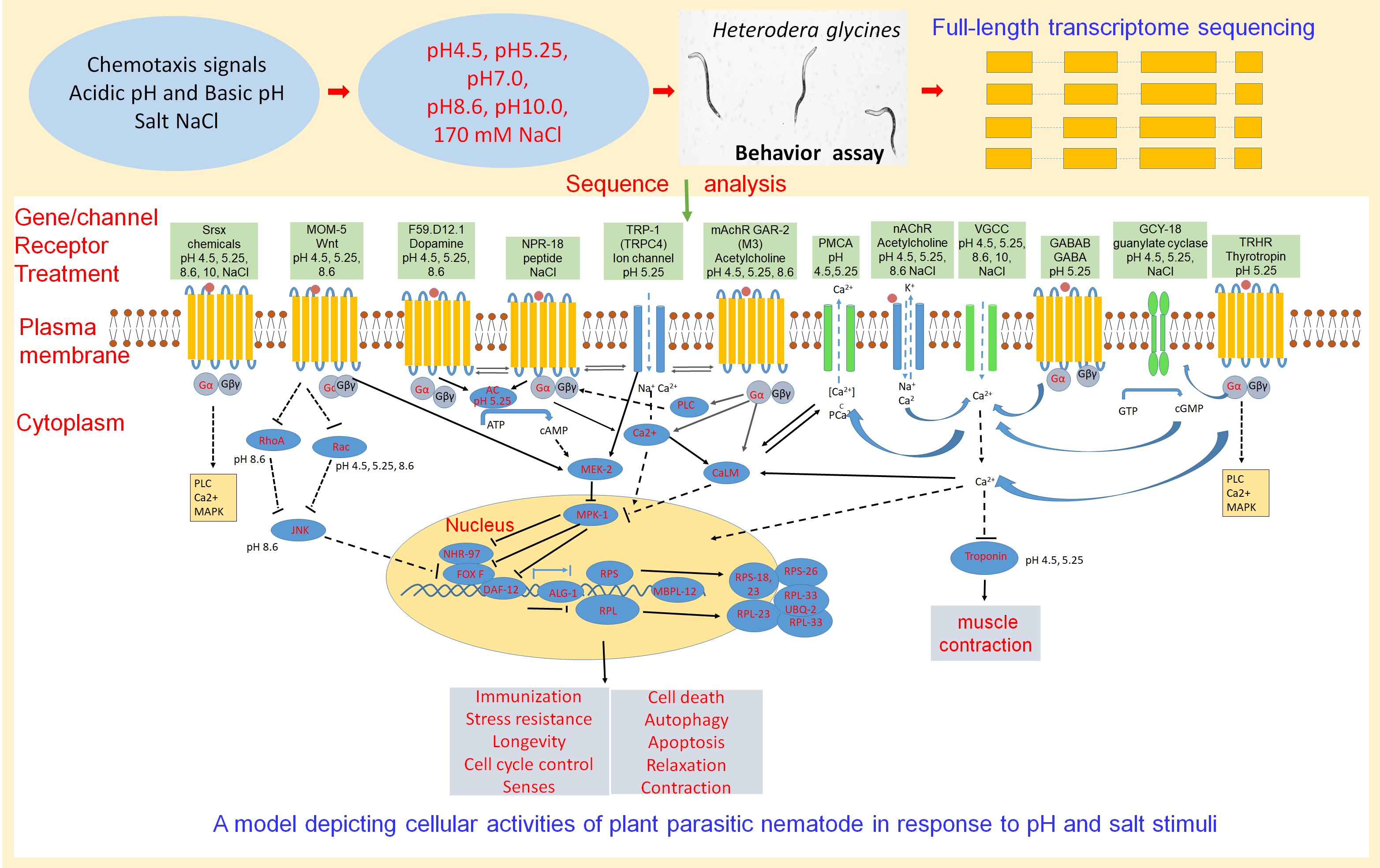 WormLab系統(tǒng)可實(shí)時(shí)追蹤定量分析線蟲(chóng)行為,精準(zhǔn)捕捉微小動(dòng)物行為變化。該研究通過(guò)大豆孢囊線蟲(chóng)二齡幼蟲(chóng)對(duì)極端pH和適宜的趨化酸性和堿性pH、NaCl鹽溶液脅迫下的行為學(xué)分析,表明線蟲(chóng)對(duì)不同非生物環(huán)境的行為學(xué)響應(yīng)存在差異(圖1)。進(jìn)一步對(duì)經(jīng)pH和NaCl溶液處理后的18個(gè)線蟲(chóng)樣本進(jìn)行三代全長(zhǎng)轉(zhuǎn)錄組測(cè)序分析,以期從轉(zhuǎn)錄或轉(zhuǎn)錄后修飾水平解析線蟲(chóng)響應(yīng)外界信號(hào)的調(diào)控機(jī)理,結(jié)果鑒定得到3,972個(gè)新基因和29,529個(gè)新轉(zhuǎn)錄本。轉(zhuǎn)錄本結(jié)構(gòu)分析表明:可變剪接(AS)、可變多聚腺苷酸化(APA)、融合轉(zhuǎn)錄本等結(jié)構(gòu)與對(duì)照相比發(fā)生了顯著的變化,說(shuō)明這些轉(zhuǎn)錄后修飾參與了線蟲(chóng)行為的調(diào)控。通過(guò)對(duì)差異表達(dá)基因GO(基因本體論)和KEGG(京都基因與基因組百科全書(shū))富集分析,結(jié)果表明跨膜受體、離子通道和鈣離子轉(zhuǎn)運(yùn)蛋白相關(guān)的信號(hào)通路被激活,核糖體和氧化磷酸化代謝途徑被抑制(圖2)。被激活的跨膜受體中至少有6種是G蛋白偶聯(lián)受體GPCR,包括化學(xué)受體SRSX、Wnt受體MOM-5、多巴胺受體F59.D12.1、肽類受體NPR-18、毒蕈堿型乙酰膽堿受體mAChR和促甲狀腺素釋放激素受體TRHR,其他受體包括煙堿型乙酰膽堿受體nAChR、GABAB(γ-氨基丁酸受體β亞單元)和鳥(niǎo)苷酸環(huán)化酶受體GCY-18能夠調(diào)控離子通道。線蟲(chóng)受體激活與生長(zhǎng)發(fā)育受到抑制說(shuō)明線蟲(chóng)在最佳趨化狀態(tài)下或者極端環(huán)境下通過(guò)調(diào)整不同的代謝途徑來(lái)維持自身能量的平衡,保持細(xì)胞穩(wěn)態(tài),維持生存。在酸堿鹽條件下線蟲(chóng)的反應(yīng)和存活機(jī)制也證實(shí)了大豆孢囊線蟲(chóng)能在酸堿鹽土壤中發(fā)生的原因。結(jié)合差異表達(dá)基因和蛋白與蛋白互作分析構(gòu)建了大豆孢囊線蟲(chóng)響應(yīng)pH和鹽離子刺激的細(xì)胞網(wǎng)絡(luò)調(diào)控模型(圖2)。本研究結(jié)果不僅豐富了線蟲(chóng)對(duì)化學(xué)信號(hào)反應(yīng)機(jī)制的知識(shí),而且所鑒定的不同跨膜受體及其離子通道是挖掘新型殺線劑的重要靶標(biāo)。由于寄生線蟲(chóng)的保守性,由此推測(cè)大豆孢囊線蟲(chóng)可以作為一個(gè)模式寄生線蟲(chóng)研究線蟲(chóng)化感信號(hào)識(shí)別和反應(yīng)機(jī)制,這些鑒定的受體也是開(kāi)發(fā)藥物防治人畜寄生線蟲(chóng)的潛在靶標(biāo),研究結(jié)果具有重要的科學(xué)意義和潛在的應(yīng)用價(jià)值。