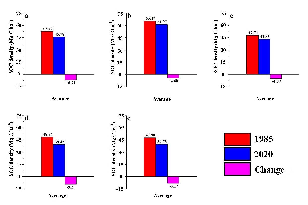 圖1東北地區35年來土壤有機碳密度變化(a代表東北地區;b代表黑龍江省;c代表吉林省;d代表遼寧省;e代表內蒙古)