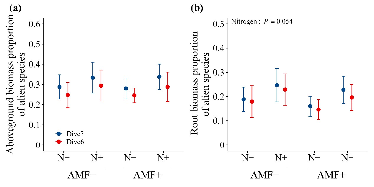 基于這一背景,中國科學院東北地理與農業生態研究所和東北師范大學的研究人員,以9種入侵植物和12個人工群落(兩個多樣性梯度)構建的108個入侵系統為目標,結合養分添加和AMF添加處理,探究了不同生物和非生物環境下生物多樣性阻抗入侵的機制。