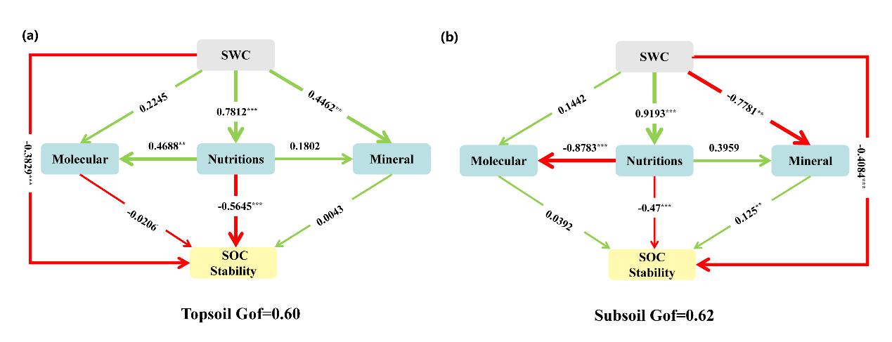 研究結(jié)果表明:在表層土壤中(0-20cm),Fe、Mn礦物保護(hù)和分子抗性(熱裂解產(chǎn)物)分別解釋了土壤有機(jī)碳穩(wěn)定性的16% 和 14%,隨機(jī)森林分析結(jié)果顯示微生物對(duì)其穩(wěn)定性也有著重要的貢獻(xiàn);而底層土壤(>20cm),Fe、Mn礦物保護(hù)和分子抗性分別解釋了9% 和 26%,這表明分子抗性在底土中對(duì)有機(jī)碳穩(wěn)定性發(fā)揮著更為關(guān)鍵的作用。同時(shí),我們發(fā)現(xiàn)植物來源的碳輸入對(duì)底土中的 SOC 穩(wěn)定性有重要貢獻(xiàn)。礦物保護(hù)與分子抗性二者的交互作用在控制 SOC 穩(wěn)定性方面發(fā)揮了重要作用,分別解釋了表土和底土有機(jī)碳穩(wěn)定性的25% 和 39%,這說明這種交互作用在底土中更為重要。