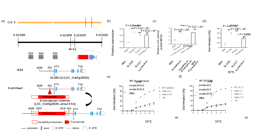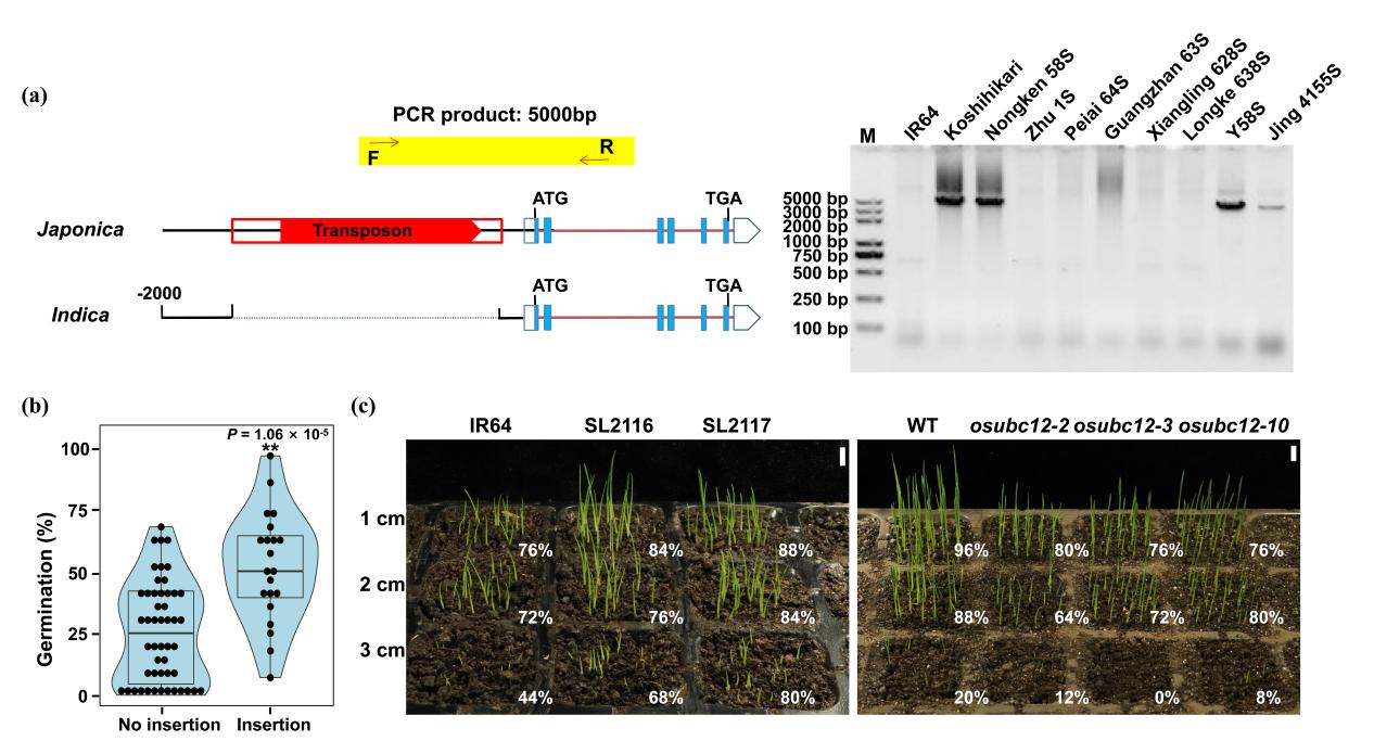 近日,東北地理所方軍研究員團隊關于水稻低溫萌發的最新研究成果刊發在國際綜合性期刊頂級B刊Nature Communications(IF=16.6)上。研究發現,E2泛素耦合酶基因OsUBC12啟動子中轉座子的插入能夠顯著提高其轉錄水平,進而增強粳稻的低溫萌發能力,并進一步揭示了UBC12調控水稻低溫萌發的潛在機制,為培育適合直播特性水稻品種提供了基因及種質資源。