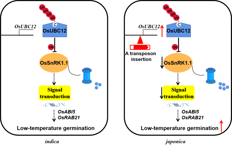 基于以上結果,該研究提出了OsUBC12參與調控水稻低溫萌發的工作模型(圖4):OsSnRK1.1作為下游的關鍵調節因子,通過上調ABA信號抑制低溫萌發。OsUBC12主要催化K48-多聚泛素化修飾,能夠招募OsSnRK1.1并促進OsSnRK1.1的降解。與秈稻相比,粳稻OsUBC12啟動子中轉座子的插入顯著激活OsUBC12的表達。而豐度提高的OsUBC12蛋白進一步促進OsSnRK1.1的降解,從而削弱OsSnRK1.1調節的ABA信號傳導,增強粳稻的低溫萌發能力。