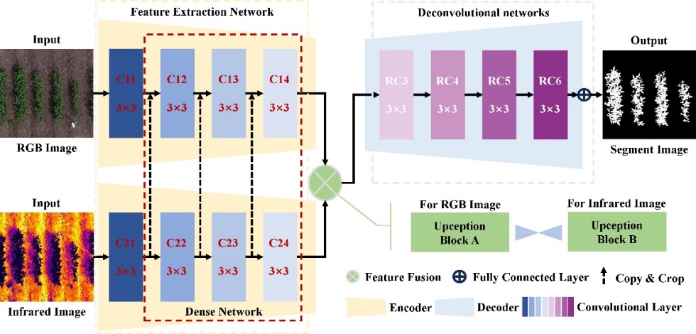 近日,中國科學院東北地理與農業生態研究所馮獻忠團隊從中國東北地區收集了200份代表性大豆品種,并利用無人機飛行系統采集了表型數據。為了克服高通量表型研究中遇到的挑戰,設計了一個專門用于大豆田間冠層分割的多模態深度學習模型——RIFSeg-Net,并利用紅外信息提高無人機拍攝的RGB圖像中大豆冠層的分割精度。通過動態建模,利用時間序列無人機圖像數據提取并構建了與冠層發育動態相關的五個表型參數。該方法展示了典型的無人機高通量表型解21析過程,提出了對大豆生長模式和動態監測的見解,并成功應用于田間大規模種質資源鑒定,為培育高產大豆品種提供了強有力的工具。