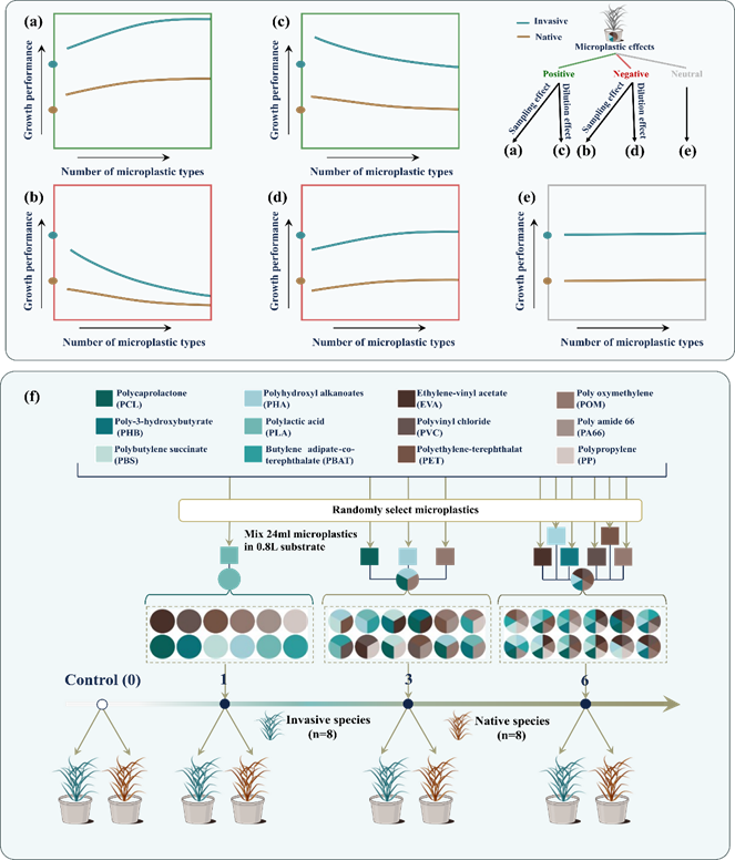 ????微塑料對植物造成的生態后果的不確定性與微塑料和植物種類的不同密切相關。如果不同類型的微塑料相互作用,那么多種類型微塑料對植物綜合影響的復雜性將會被放大。外來入侵植物通常被認為比本地植物更受益于有利的環境條件,也往往更容易受到惡劣環境條件的影響。因此,微塑料多樣性可能以不同方式影響外來入侵植物和本地植物的生長表現。基于以上研究背景,我們假設:(1)如果某些微塑料有利于植物生長,則當抽樣效應占主導地位時,外來入侵植物可能比本地植物對微塑料多樣性的增加做出更有利的反應;當稀釋效應占主導地位時,外來入侵植物可能比本地植物對微塑料多樣性的增加做出更不利的反應。(2)或者,如果某些微塑料不利于植物生長,則當抽樣效應占主導地位時,外來入侵植物可能比本地植物對微塑料多樣性的增加做出更消極的反應;當稀釋效應占主導地位時,外來入侵植物可能比本地植物對微塑料多樣性的增加表現出更小的消極反應。(3)如果在微塑料不產生任何影響的情況下,我們認為植物的表現將不受微塑料存在和多樣性的影響,而外來入侵植物可能會比本地物種具有更高的生長表現。