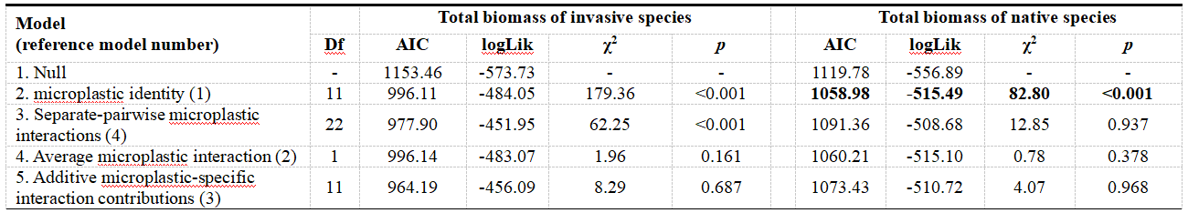 ????此外,通過hierarchical diversity-interaction 模型發現,微塑料多樣性對外來入侵植物總生物量的負面影響既受微塑料性質的影響,也受某些類型微塑料的影響,兩者之間存在強烈的配對相互作用。相比之下,對本地植物的影響則完全取決于微塑料性質(表1)。