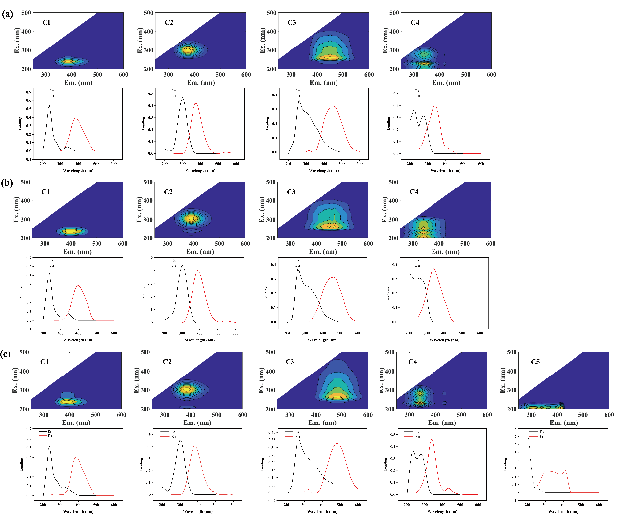 圖1. 通過平行因子分析法(PARAFAC)確定的水溶性有機(jī)質(zhì)(a),富里酸(b)和胡敏酸(c)的熒光組分