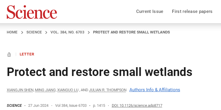 Xiangjin Shen, Ming Jiang, Xianguo Lu, Julian R. Thompson. Protect and restore small wetlands, Science, 2024, 384: 1415. DOI: 10.1126/science.adp8717.
