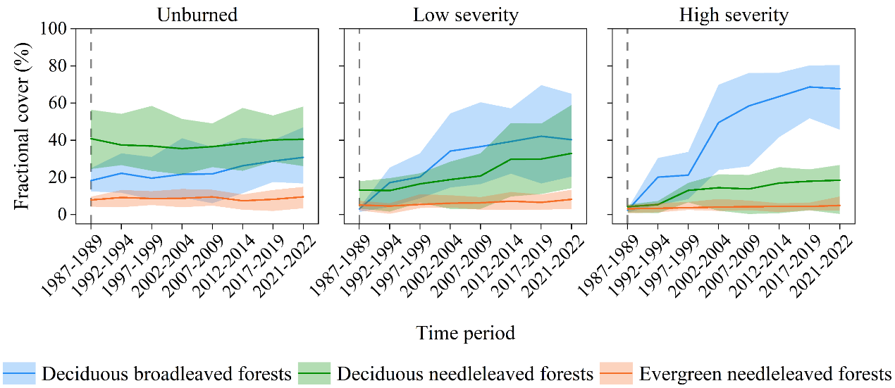 圖2. 不同燃燒強度區(qū)域中森林類型覆蓋率的時間序列