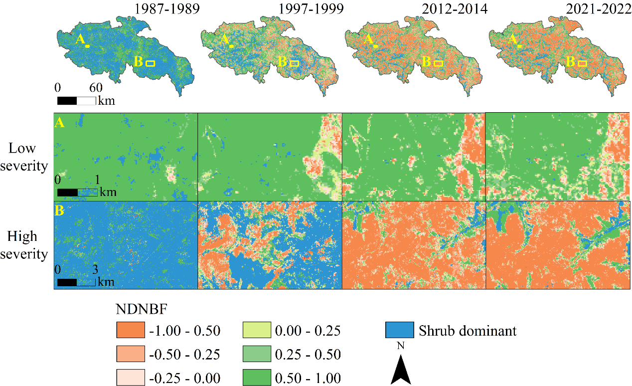 圖3. 特大火燒區(qū)內(nèi)NDNBF指數(shù)的時空變化 (NDNBF指歸一化針葉林-闊葉林差異指數(shù))