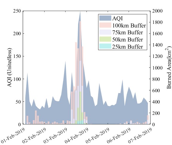 本研究通過提取可見紅外成像輻射儀(VIIRS)火點(diǎn)數(shù)據(jù)、中分辨率成像光譜輻射儀(MODIS)燃燒面積數(shù)據(jù),對比研究了這兩種不同秸稈焚燒參數(shù)與大慶市為中心不同緩沖區(qū)空氣質(zhì)量的相關(guān)性。