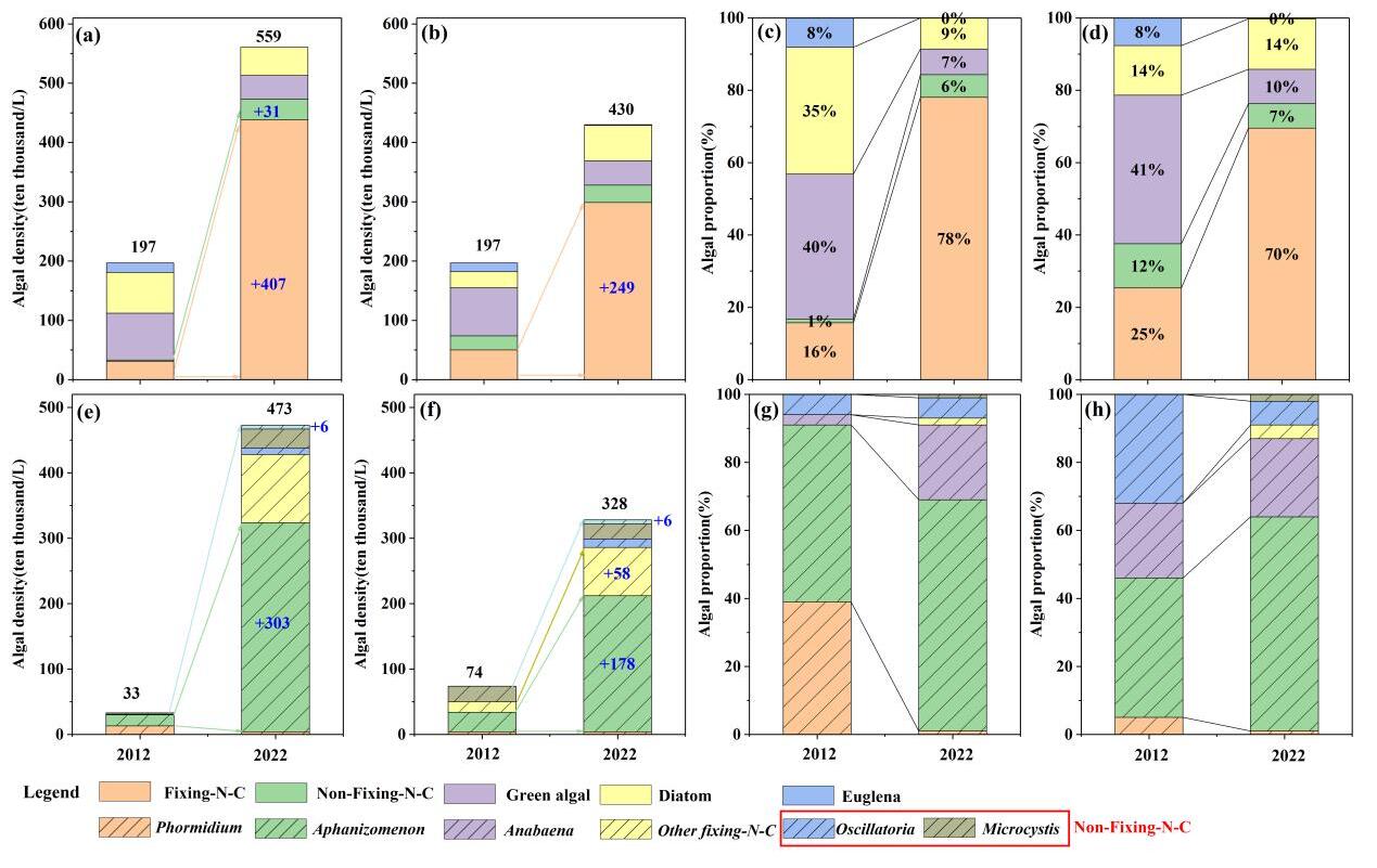 圖1?查干湖2012-2022年退水期和非退水期浮游植物密度和物種比例的動態變化。(a)和(b)表示有和沒有退水時藻類密度的變化;(c)和(d)表示有和沒有退水時藻類比例的變化