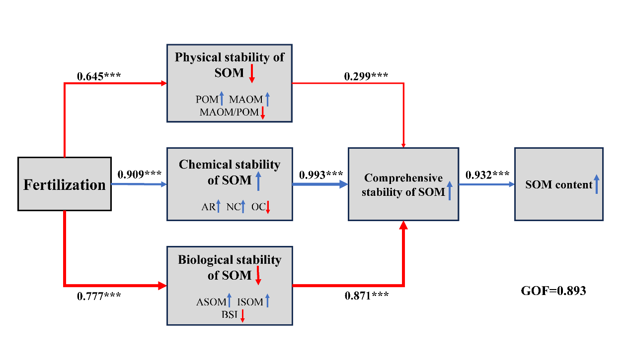 研究發現,與不施肥相比,施肥措施主要促進了具有較高活性的POM含量的增加,其中有機物料的施用效果顯著優于單一施用化肥,但施肥后降低了MAOM/POM,進而降低了SOM的物理穩定性。另外,長期施肥顯著增加了SOM中的芳香化合物、含氮化合物和含硅化合物等穩定成分的含量,提高了SOM的化學穩定性。而針對SOM的生物穩定性,施肥主要促進了SOM中可礦化有機質(ASOM)的形成,提高了SOM的礦化速率常數,降低了SOM的BSI,從而降低了SOM的生物穩定性(圖1)。不同施肥措施主要通過提高SOM的化學穩定性而提高了SOM的綜合穩定性,而SOM穩定性的變化直接影響了SOM的含量(圖2、圖3)。研究結果證明,施肥可以提高SOM的綜合穩定性,且化肥配施秸稈和化肥配施有機肥的效果明顯優于單施化肥。本研究為長期不同施肥管理下SOM穩定性變化及其固存機制提供了科學依據。