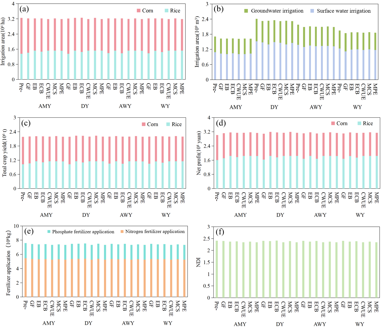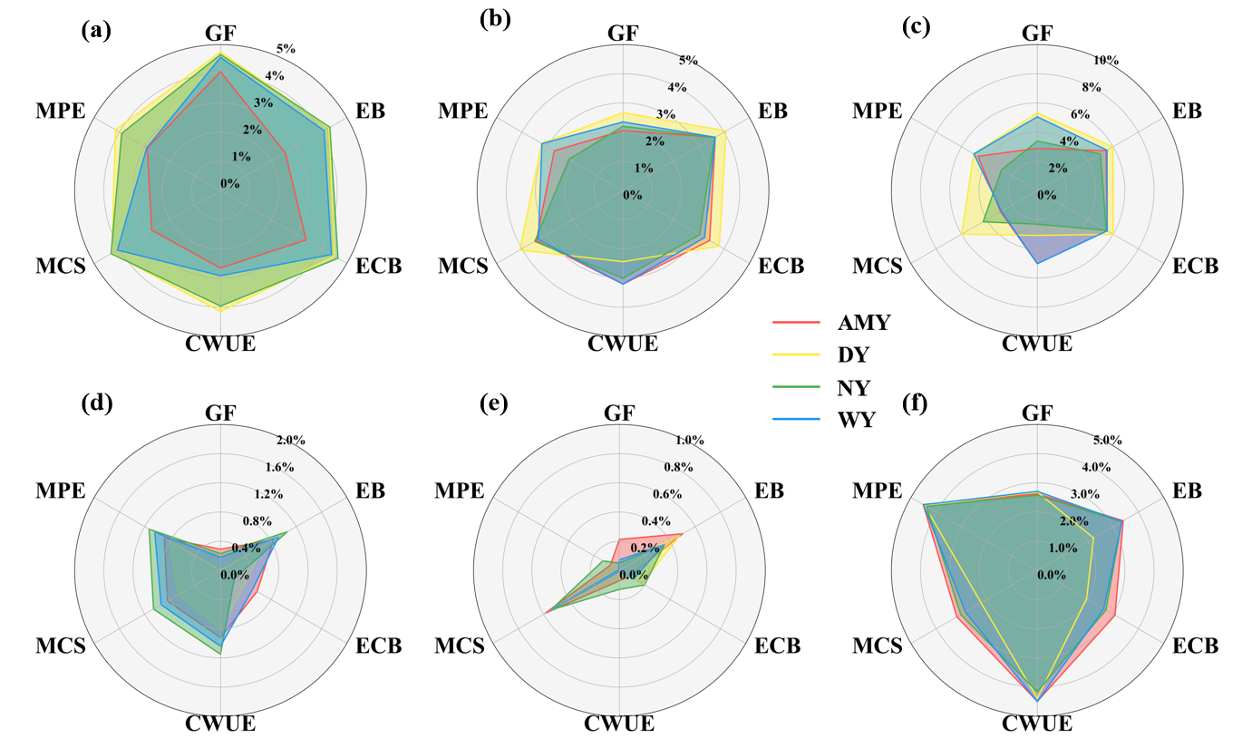 圖3 大安灌區的優化配置結果 (a–d)年灌溉面積、灌溉水源、作物總產量和每種作物的凈利潤;(e)氮磷肥施用量;(f)NDI污染指數(側重地下水足跡(GF),側重經濟效益(EB),側重生態效益(ECB),側重作物用水效率(CWUE),側重碳固存(MCS),側重污染物排放(MPE))。