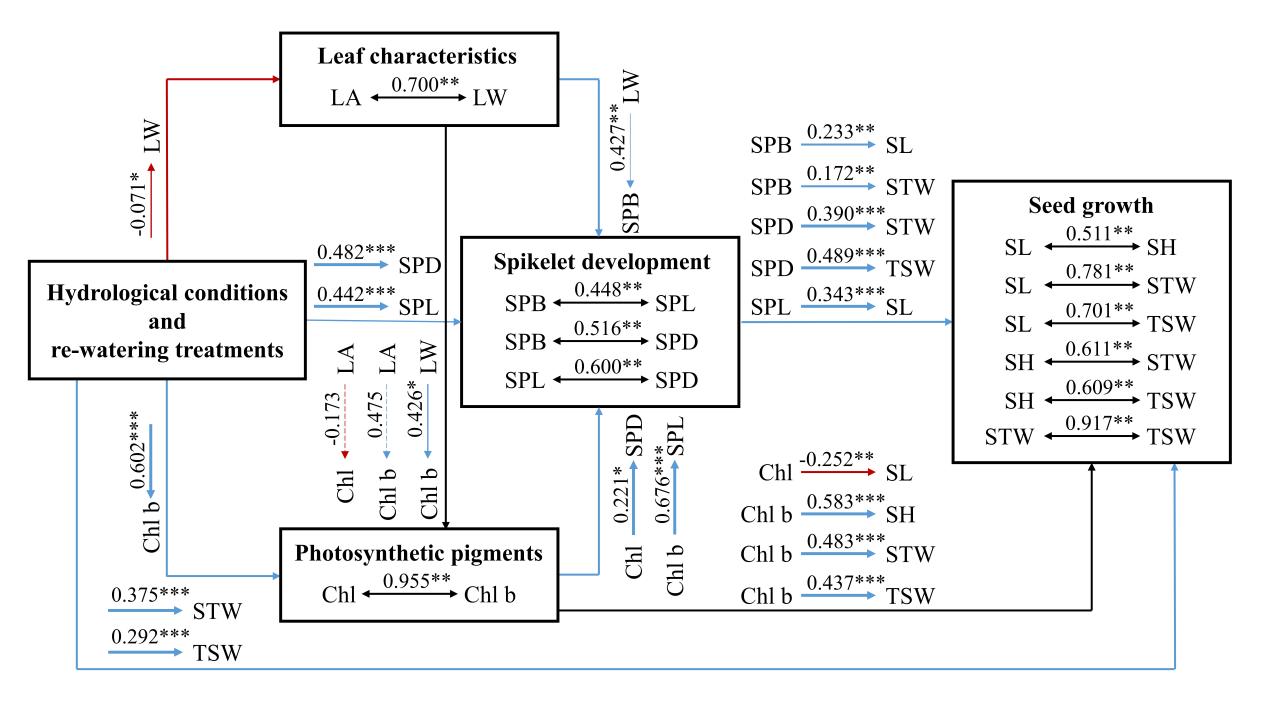 研究結果表明,初始水文條件和分時補水措施顯著影響了瘤囊薹草的小穗發育、種子生長、葉片發育以及光合色素積累。相較于其他處理,濕潤條件結合第15天補水至初始水文狀態的水文情勢顯著增強了瘤囊薹草小穗發育特征、種子生長特性,且葉片生態特征及葉綠素含量均高于其他處理條件。此外,小穗發育特征和種子生長性狀與葉片生態特征和葉綠素含量表現出顯著的相關性。在驅動機制方面,水文條件及補水情境直接影響了瘤囊薹草的小穗發育和種子生長,同時還通過調控葉片寬度和葉綠素b含量從而間接影響小穗發育過程和隨后的種子生長活動??傮w而言,精準補水措施通過多種途徑顯著影響瘤囊薹草的小穗發育和種子生長。結合半干旱區氣候特征及農業發展狀況,實施洪水和融雪水資源集約化利用以及農業-生態水資源共管可作為半干旱地區高效利用水資源的關鍵策略。