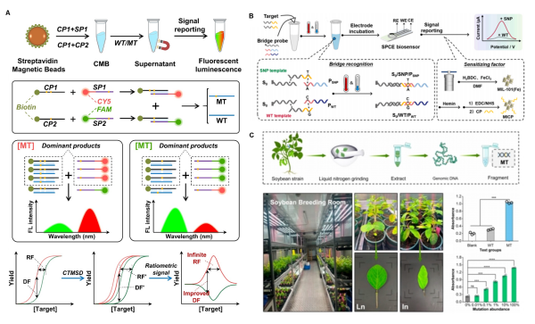 圖1. (A)比率信號(hào)擴(kuò)增輸出窗口、(B)橋聯(lián)探針識(shí)別SNP以及(C)大豆基因組提取與檢測示意圖