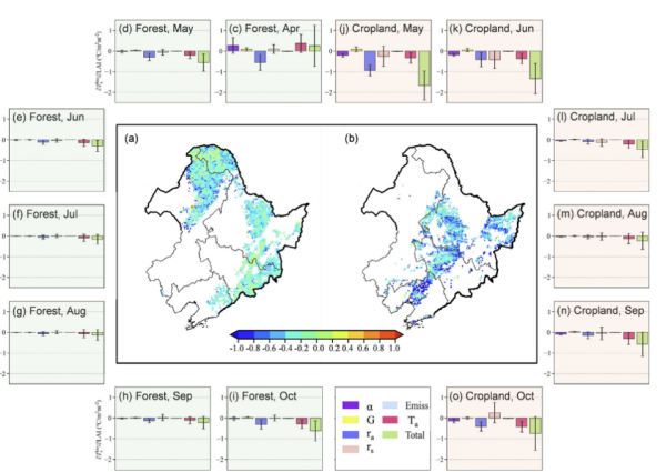 圖2. 東北地區(qū)森林和農(nóng)田植被物候變化對(duì)地表溫度的影響及生物地球物理機(jī)制