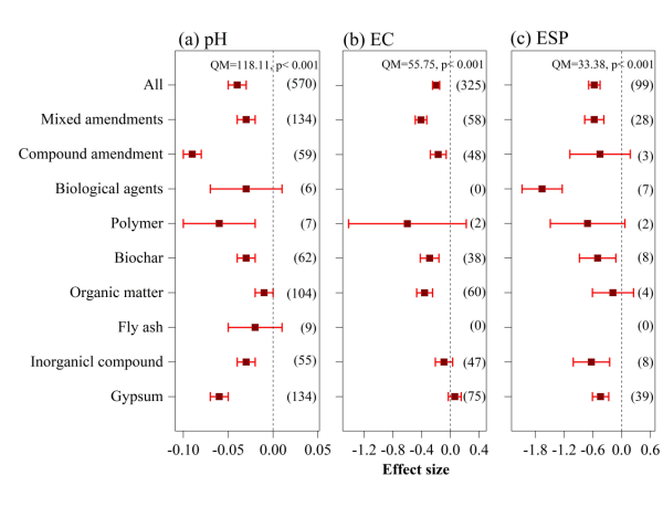 研究采用Meta分析方法,綜合了全國(guó)范圍內(nèi)1992-2022年30年間公開(kāi)發(fā)表的有關(guān)不同改良劑在鹽堿地改良效果上的相關(guān)報(bào)道,采納了有關(guān)田間試驗(yàn)報(bào)道的92篇相關(guān)文獻(xiàn)中的2061組研究數(shù)據(jù),綜合分析了當(dāng)前國(guó)內(nèi)鹽堿土改良劑的研究現(xiàn)狀,量化評(píng)估了不同類(lèi)型改良劑對(duì)鹽堿土的改良效果,利用機(jī)器學(xué)習(xí)模型解析了影響改良劑應(yīng)用效果的相關(guān)因素。