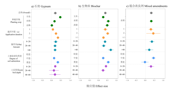 研究發(fā)現(xiàn),不同類(lèi)型改良劑的改良效果存在顯著差異(p < 0.05),石膏類(lèi)改良劑、生物炭和混合改良劑施用后土壤堿度分別降低21.5%、19.6%和37.0%;生物炭對(duì)土壤養(yǎng)分含量提升效果最佳(47.8%),石膏類(lèi)改良劑相對(duì)最低(26.4%)。三種改良劑多用于中、重度蘇打鹽堿土表層(0~20 cm)土壤改良,其施用量和施用年限對(duì)土壤改良效果存在差異。改良劑施用量是影響石膏類(lèi)改良劑、生物炭和混合改良劑等降低土壤堿化度和鹽分效果的主要因素。石膏類(lèi)改良劑主要作用原理是降低土壤堿度,進(jìn)而間接提升土壤養(yǎng)分和促進(jìn)作物生長(zhǎng),生物炭和混合改良劑兼具降低土壤堿度和直接提供土壤養(yǎng)分的作用。土壤改良劑在選擇使用上不僅要考慮用量,種植作物類(lèi)型、改良劑成本、作用效果持久性以及環(huán)境安全性問(wèn)題也是重要的參考因素。這些研究結(jié)果為蘇打鹽堿地改良劑的科學(xué)選擇提供了理論依據(jù)。