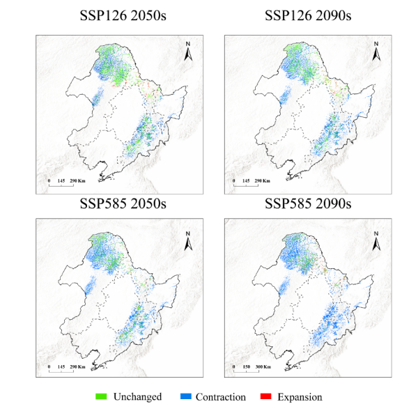 中國科學(xué)院東北地理與農(nóng)業(yè)生態(tài)研究所濕地生物與環(huán)境學(xué)科組研究人員基于野外調(diào)查以及文獻(xiàn)搜集獲取了點(diǎn)位尺度的泥炭地分布數(shù)據(jù),通過多種算法結(jié)合以及最優(yōu)模型篩選的方式構(gòu)建了東北地區(qū)的泥炭地分布模型。并基于當(dāng)前氣候條件以及未來兩種氣候情景(SSP126,SSP585)下21世紀(jì)中(2040-2060年)和21世紀(jì)末(2080-2100年)的泥炭地潛在分布及變化動(dòng)態(tài)。