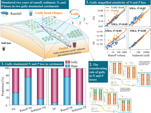 近日,東北地理所黑土退化與修復(fù)學(xué)科組郭明明研究團(tuán)隊(duì)在降雨下溝道調(diào)控東北黑土區(qū)農(nóng)業(yè)集水區(qū)徑流、泥沙、氮和磷的流失模式取得進(jìn)展。該項(xiàng)研究以東北黑土區(qū)2條侵蝕溝所在集水區(qū)為研究對(duì)象,對(duì)2022、2023年所有次降雨過程中入溝和出流域的徑流、泥沙、氮和磷流失過程進(jìn)行了原位監(jiān)測(cè)。結(jié)果表明:集水區(qū)63.9%的徑流源自坡面,而溝道貢獻(xiàn)了集水區(qū)95.1%的土壤流失量;在總氮和總磷流失中,溝道的作用也顯著大于坡面,分別貢獻(xiàn)了集水區(qū)總氮和總磷流失總量的71.6%和94.8%。徑流與泥沙來源的空間異質(zhì)性顯著改變了氮磷流失形態(tài),從坡面到溝道,總氮流失的主導(dǎo)形態(tài)從徑流總氮轉(zhuǎn)變?yōu)槟嗌晨偟瑫r(shí)進(jìn)一步提高了集水區(qū)內(nèi)泥沙總磷流失的占比(>90%)。總氮和總磷流失對(duì)土壤流失過程的敏感性均顯著高于徑流過程(圖1)。這表明,在以溝道為主導(dǎo)的集水區(qū)中,控制土壤流失比減少徑流更能有效緩解農(nóng)田氮、磷的流失,因此調(diào)流控蝕應(yīng)作為農(nóng)業(yè)集水區(qū)氮磷管理的優(yōu)先策略。研究結(jié)果可為溝道主導(dǎo)型農(nóng)業(yè)集水區(qū)的侵蝕防治和面源污染治理提供科學(xué)依據(jù)。