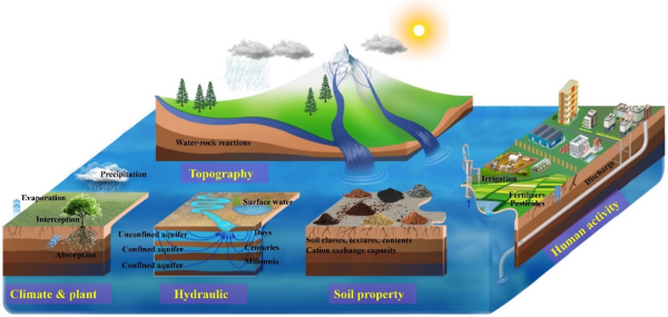 圖1 地下水溶質(zhì)動態(tài)示意圖,展示了自然過程(如氣候、土壤性質(zhì)、植物吸收和地下水-地表水相互作用)與人為干擾(如城市化、農(nóng)業(yè)、廢物處置)之間的水力聯(lián)系與相互作用,以及它們對地下水系統(tǒng)的綜合影響。