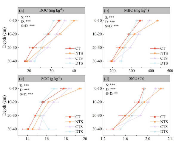 東北地理所黑土保護與利用學科組研究人員基于不同耕作方式耦合秸稈還田的長期定位試驗,系統研究了0-10、10-20、20-30和30-40 cm土層中SMQ的垂直分布特征,進一步結合三維熒光和同步熒光光譜技術對DOM的熒光結構進行表征,旨在闡明不同秸稈還田方式通過調控DOM特性提升SMQ的關鍵過程機制。