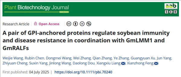 Wang, W., Chen, R., Wang, D., Zhang, W., Zhang, Q., Zhang, Y., Xu, G., Yang, J., Cheng, Z., Yang, S., Wang, J., Dou, D., Liang, X. and Feng, X. (2025), A pair of GPI-anchored proteins regulate soybean immunity and disease resistance in coordination with GmLMM1 and GmRALFs.
