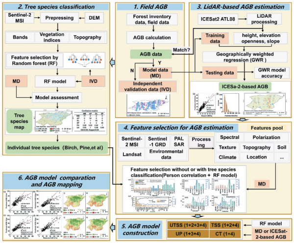 東北地理所地理景觀遙感學(xué)科組研究人員集成應(yīng)用主被動遙感影像(ICESat-2 LiDAR、ALOS-2 PALSAR、Sentinel-1和Sentinel-2)和環(huán)境數(shù)據(jù)(氣候、地形、土壤和干擾數(shù)據(jù)),結(jié)合實測生物量和優(yōu)勢樹種調(diào)查數(shù)據(jù),提出了從地面樣點到激光雷達(dá)光斑的樣本擴充策略,研發(fā)了協(xié)同森林三維結(jié)構(gòu)特征、高精度樹種類型以及環(huán)境異質(zhì)性參數(shù)的升尺度樹種分層生物量遙感估算模型。以中國北方森林作為研究區(qū),與傳統(tǒng)模型、升尺度模型(僅考慮樣本擴充策略)和樹種分層模型(僅考慮樹種分層策略)進(jìn)行對比,驗證了升尺度樹種分層模型的有效性。結(jié)果表明:升尺度樹種分層模型的森林生物量估算精度(R2=0.82,rRMSE=24.8%)顯著優(yōu)于傳統(tǒng)模型、升尺度模型和樹種分層模型(R2:0.65-0.75,rRMSE:26.98-32.03%)。該模型通過整合森林垂直結(jié)構(gòu)信息和增加樣本量改善了生物量估算結(jié)果,降低了對實測樣本的依賴;通過降低樹種間水平和垂直結(jié)構(gòu)的異質(zhì)性干擾,并適配樹種與環(huán)境交互的局部特征,提升了生物量估算精度。本研究基于開放數(shù)據(jù)集、算法和平臺的升尺度樹種分層生物量估算框架,為區(qū)域乃至全球尺度生物量精準(zhǔn)估算提供了有效途徑。