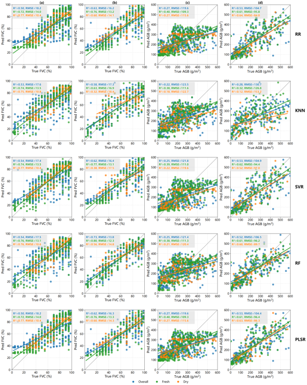 建模過程中,研究采用了五種主流回歸算法(嶺回歸、k近鄰、支持向量回歸、隨機森林和偏最小二乘回歸),并分別在兩組輸入變量上開展訓練。結果表明,對鮮草和干草分別建模,平均可提升模型決定系數(R2)0.23,最大降低均方根誤差(RMSE)達41%。其中,融入植被高度信息對提升AGB估算精度尤為關鍵,最優模型R2可達0.62(圖3)。該研究所提出的技術框架僅依賴輕量化RGB影像和低成本計算資源,具備實地實時應用的巨大潛力,為多尺度草地遙感監測與生態評估提供了新的可靠工具。