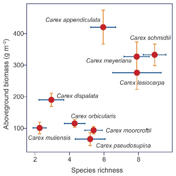 東北地理所科研人員結合國家濕地資源調查數據與遙感獲取的氣候信息數據,以我國125個典型莎草類濕地樣點為研究對象,明確了我國國家尺度濕地地上生物量的空間格局,分析了莎草類濕地植物物種豐富度與地上生物量的關系,揭示了生物和非生物因素對地上生物量的貢獻及影響機制。研究結果表明,中國不同氣候區莎草類濕地地上生物量具有顯著差異。非生物因子和生物因子共同影響莎草類濕地地上生物量。其中,生物因子在決定地上生物量分布格局中占主導地位。植物物種豐富度對地上生物量具有促進作用,而地上生物量與物種豐富度的關系受群落類型調控。此外,年平均降水量是影響莎草類濕地地上生物量空間分布的最主要非生物因子,二者呈正相關關系。土壤性質不僅直接影響地上生物量,還通過物種豐富度和群落類型間接影響地上生物量。