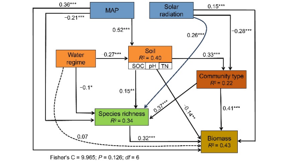 圖4 結構方程模型揭示生物與非生物因子對中國莎草類濕地地上生物量的影響路徑