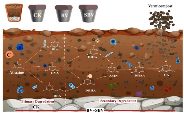 研究團(tuán)隊(duì)通過室內(nèi)盆栽實(shí)驗(yàn),結(jié)合高通量測序、液相色譜-質(zhì)譜聯(lián)用(LC-MS)和冗余分析(RDA)等技術(shù),系統(tǒng)分析了蚯蚓糞堆肥和牛糞堆肥對黑土中農(nóng)藥降解效率、微生物群落結(jié)構(gòu)及其代謝路徑的影響,并對比了不同土壤類型(黑土與鹽堿土)中堆肥的作用差異。研究明確了關(guān)鍵環(huán)境因子與微生物代謝的耦合機(jī)制,具體發(fā)現(xiàn)包括:蚯蚓糞堆肥雖未顯著提升莠去津母體的去除率,但使其初級代謝產(chǎn)物(HYA、DIA、DEA)總量降低了38.67%,并檢測到5種次級降解產(chǎn)物(如DIHA、CA等),表明其加速了莠去津的深度降解。添加蚯蚓糞堆肥使乙草胺降解率提高10.81%,半衰期縮短至8.41天,并顯著改變了細(xì)菌群落組成。在黑土中添加4%(質(zhì)量比)牛糞堆肥,可使咪唑乙煙酸降解率提高12.58%,半衰期縮短53.37%。對比發(fā)現(xiàn),土壤類型是影響修復(fù)效果的關(guān)鍵因素:在鹽堿土中,牛糞堆肥反而抑制了咪唑乙煙酸的降解。