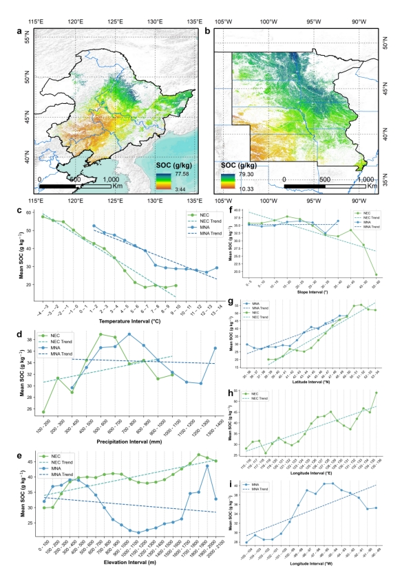 土壤有機(jī)碳(Soil Organic Carbon,SOC)在全球碳循環(huán)中發(fā)揮著關(guān)鍵作用,是全球最大的陸地有機(jī)碳庫。然而,關(guān)于中國東北黑土區(qū)(NEC)和北美密西西比河流域黑土區(qū)(MNA)SOC含量的空間分布格局及其與環(huán)境因子(氣候、地形等)的關(guān)系仍不清晰,制約了跨區(qū)域碳管理與精準(zhǔn)保護(hù)的科學(xué)支撐。