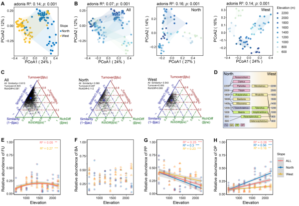 土壤線蟲(chóng)在山地生態(tài)系統(tǒng)中發(fā)揮著重要生態(tài)功能,但其在不同海拔梯度上的分布格局及群落組裝機(jī)制仍存在諸多未解之處。針對(duì)這一科學(xué)難題,土壤物質(zhì)循環(huán)學(xué)科組等研究團(tuán)隊(duì)以長(zhǎng)白山北坡和西坡為研究區(qū)域,共采集108份土壤樣品,覆蓋九個(gè)海拔高度(600-2200 m)。系統(tǒng)分析了線蟲(chóng)總體群落及不同營(yíng)養(yǎng)類型群落的空間相似性與組裝過(guò)程,并量化評(píng)估了海拔、環(huán)境距離和地理距離對(duì)群落空間變異及組裝機(jī)制的相對(duì)貢獻(xiàn)。