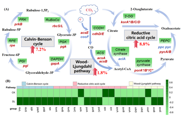 圖 1?耐鹽堿固碳菌DA1多通路固碳的機制框架
