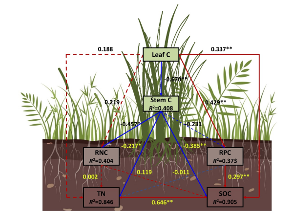 圖1. 退化濕地植物功能性狀對土壤有機(jī)碳和全氮的調(diào)控途徑