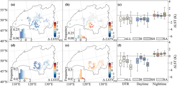 圖1. 濕地變化對(duì)白天地表溫度與夜間地表溫度(ΔLSTD 和 ΔLSTN)及其晝夜溫差(DTR)的影響。a–c:自然濕地在不同氣候區(qū)對(duì)白天、夜間溫度及晝夜溫差的影響;d–f:在相同氣候背景下人工濕地的對(duì)應(yīng)影響。ALL、H、SH 和 SA 分別代表全區(qū)、濕潤(rùn)、半濕潤(rùn)和半干旱區(qū)。點(diǎn)的顏色表示增暖或降溫效應(yīng):紅色為增暖,藍(lán)色為降溫;點(diǎn)的大小也對(duì)應(yīng) H、SH 和 SA 區(qū)域,依次增大。
