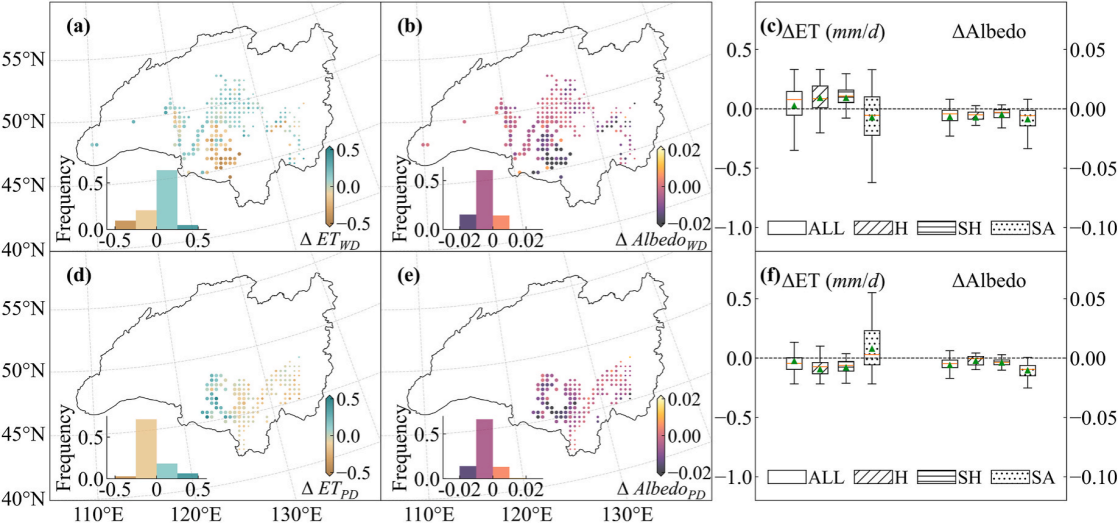 圖2. 濕地變化對(duì)生長(zhǎng)季地表過程的影響(反照率、蒸散發(fā))。a–c:不同氣候區(qū)下,自然濕地蒸散發(fā)(a)與反照率(b)變化的空間格局;c 給出相應(yīng)統(tǒng)計(jì)結(jié)果。d–f:人工濕地變化對(duì)蒸散發(fā)與反照率的影響,氣候類別與自然濕地相同。