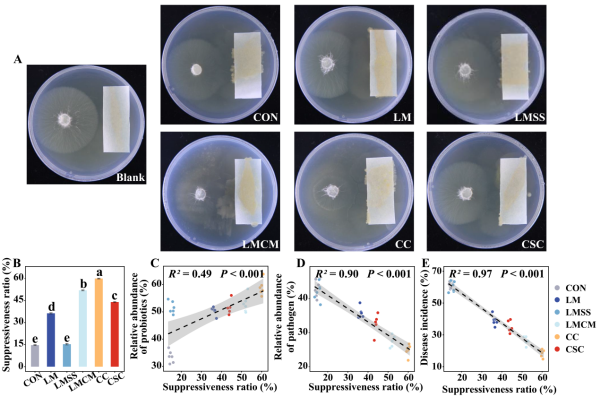 基于海倫水土保持監測研究站的田間定位試驗平臺,設置了對照(CON)、石灰(LM)、石灰秸稈配施(LMSS)、石灰牛糞配施(LMCM)、2%粗甲殼素(CC)及硅鈣鉀鎂肥(CSC)6種改良處理,系統評估了其對土壤性質、微生物群落、大豆根腐病發病率及產量的影響。結果顯示,改良劑能有效降低大豆根腐病發病率和提高大豆產量,其中CC抑病和增產效果最大,根腐病發病率降低70%,產量提高30%以上。土壤改良劑顯著富集了具有抑病和促生功能的潛在有益物種,如Pantoea、Bacillus、Humicola、 Tausonia和Mortierella,同時減少了潛在病原菌(圖1)。體外共培養實驗進一步驗證,改良土壤的根際細菌懸液明顯抑制了病原菌菌絲的生長,且該抑病能力與富集的有益菌豐度呈顯著正相關(圖2)。土壤改良劑,特別是CC處理誘導了最高的微生物抗性,證實改良劑能夠通過誘導健康的微生物區系來緩解連作障礙(圖3)。本研究明確了“改良劑-微生物抗性-病害抑制-產量提升”的級聯調控路徑,為維持土壤健康和促進作物生產提供了理論依據。