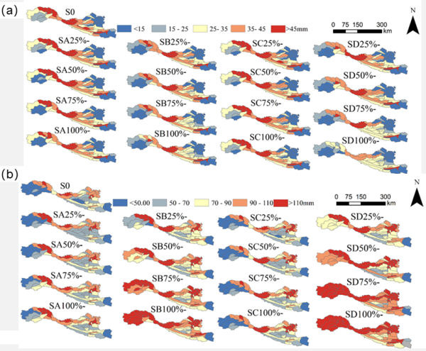 圖 2. 流域生態(tài)系統(tǒng)退化情境下水文服務(wù)功能變化。(a)、(b)、(c)、(d)分別表示基準情景(S0)和不同生態(tài)系統(tǒng)退化情景(SA?、SB?、SC?、SD?)下各子流域的單位面積水源涵養(yǎng)量、單位面積產(chǎn)水量、洪水發(fā)生月數(shù)以及干旱發(fā)生月數(shù)。SA、SB、SC 和 SD 分別代表森林、草地、濕地和綜合生態(tài)系統(tǒng)格局的變化;25%?、50%?、75%?和 100%?分別表示生態(tài)系統(tǒng)面積減少 25%、50%、75% 和 100%。SA25%?表示 25% 的森林退化。