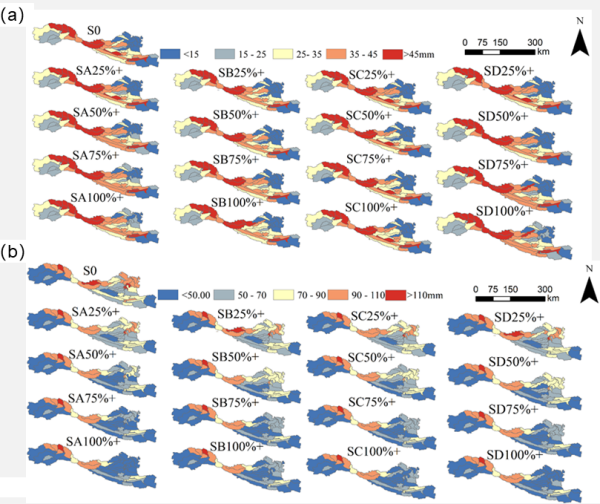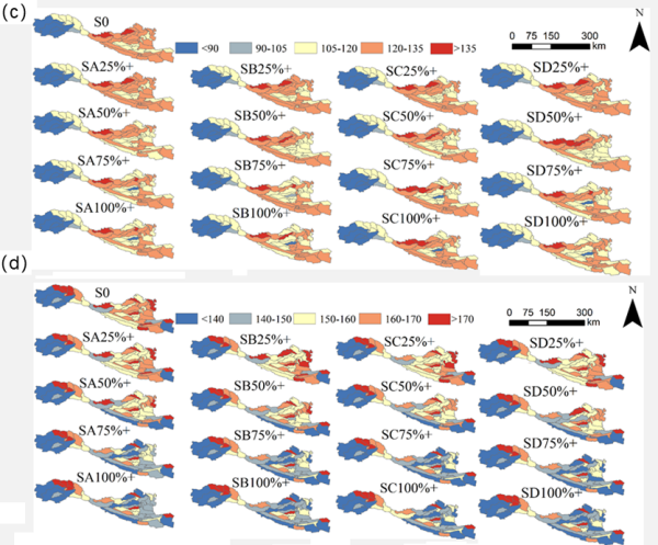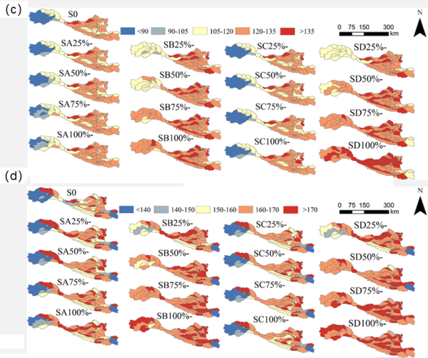 圖 3.流域生態(tài)系統(tǒng)恢復情境下水文服務(wù)功能變化(a)、(b)、(c)、(d)分別表示基準情景(S0)和不同生態(tài)系統(tǒng)保護情景(SA+、SB+、SC+、SD+)下各子流域的單位面積水源涵養(yǎng)量、單位面積產(chǎn)水量、洪水發(fā)生月數(shù)以及干旱發(fā)生月數(shù)。SA、SB、SC 和 SD 分別代表森林、草地、濕地以及綜合生態(tài)系統(tǒng);25%+、50%+、75%+ 和 100%+ 分別表示 25%、50%、75% 和 100% 的裸地轉(zhuǎn)化比例。SA25%+ 表示將 25% 的裸地轉(zhuǎn)化為森林。